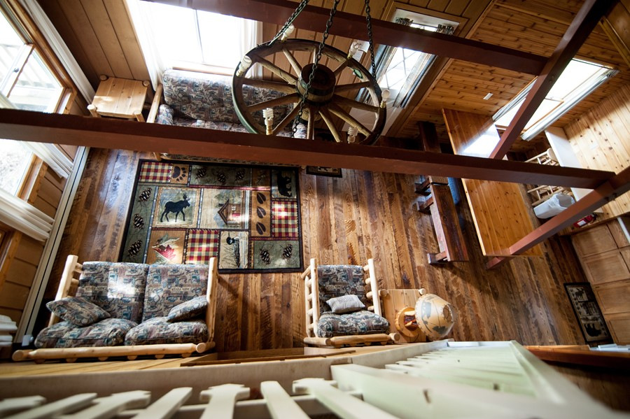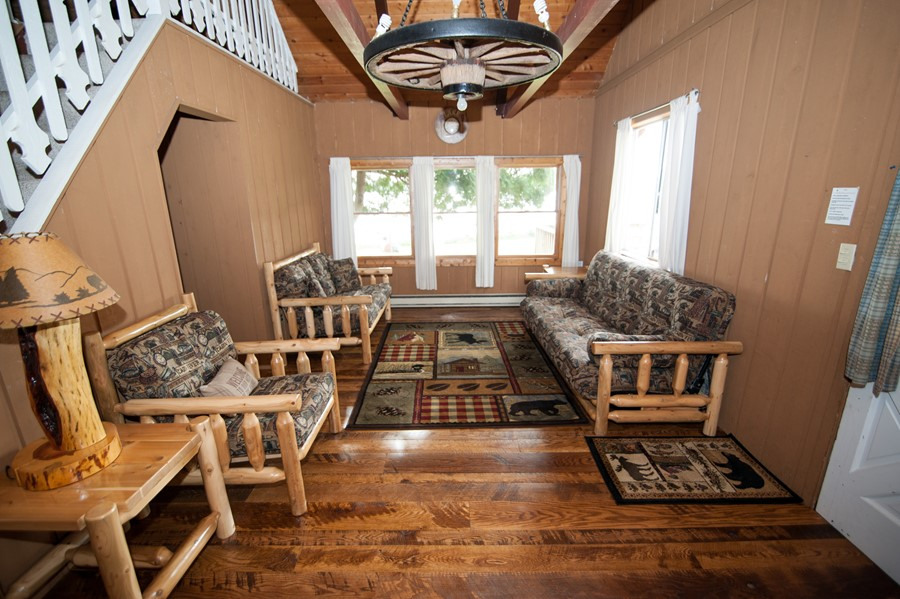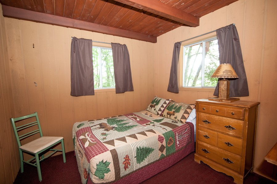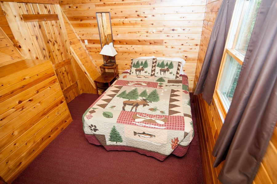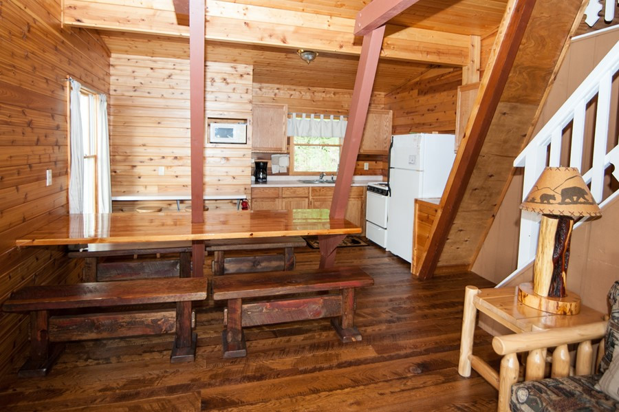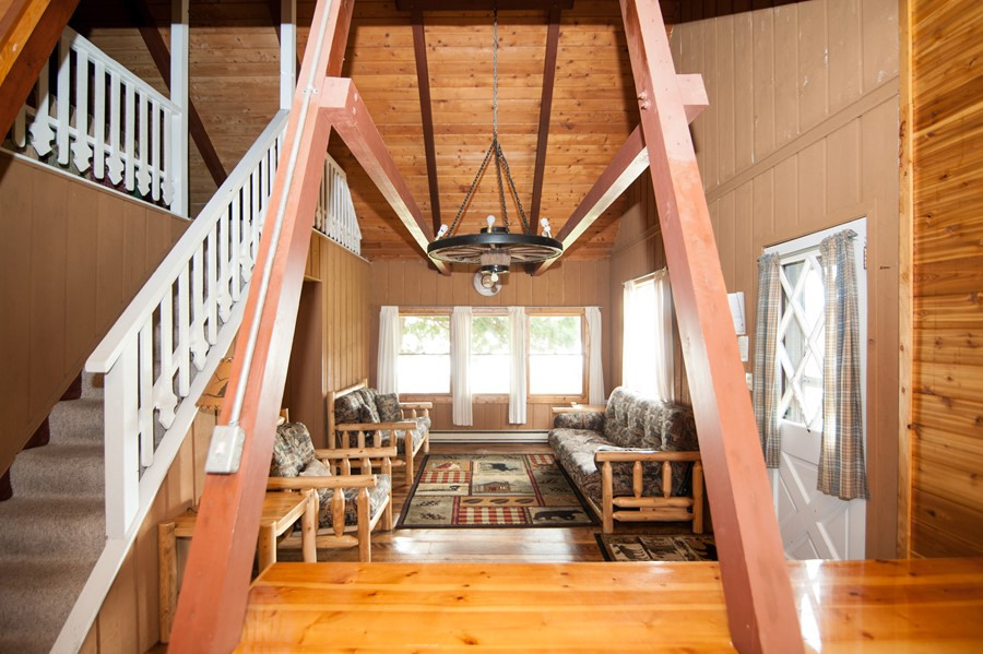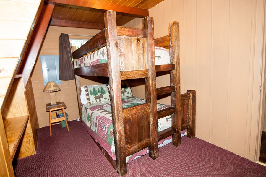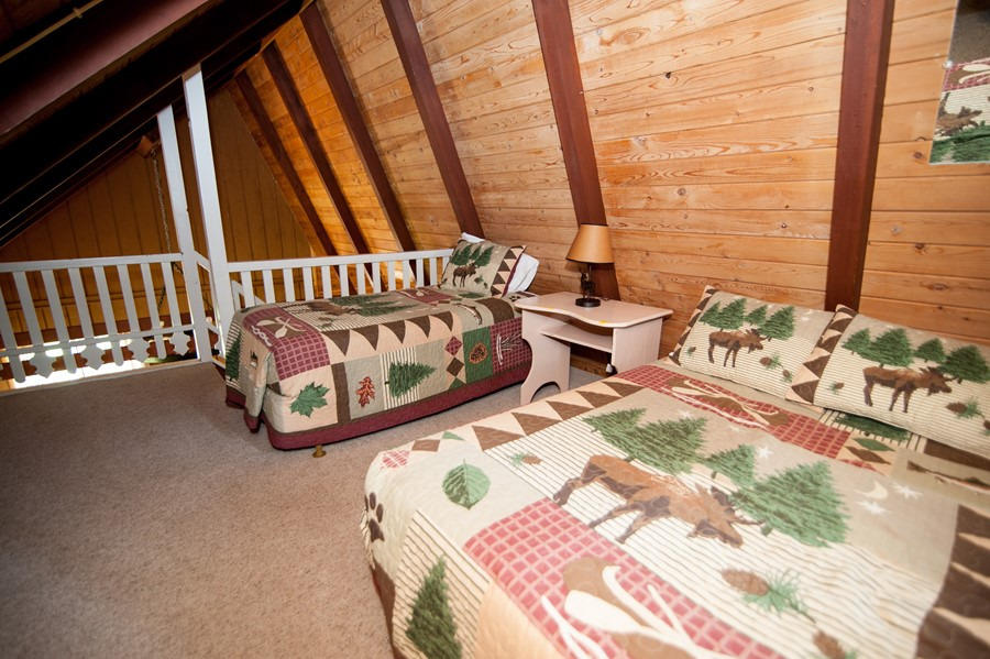 Modified and remodeled A-Frame with 3 bedrooms plus a large loft. 1 queen, 3 double beds, 1 twin(Bunk) & 1 single plus hide-a-bed. Picture window overlooking lake. Wood & beam interior. Shower. Best view and deck on the resort! Rate based on 8, max occupancy 10.