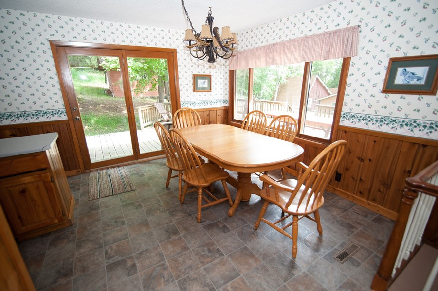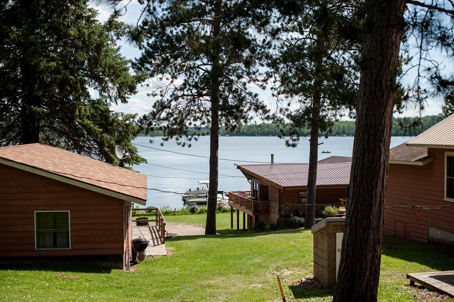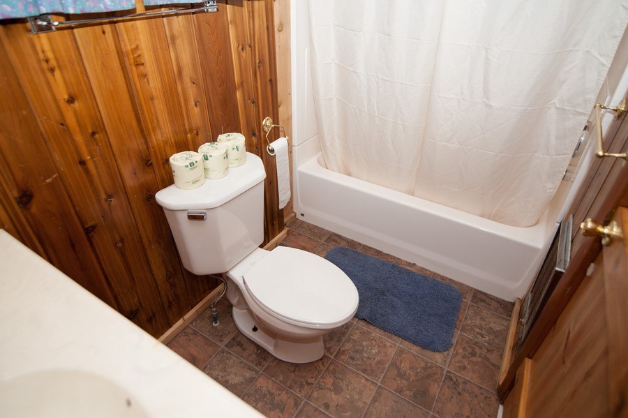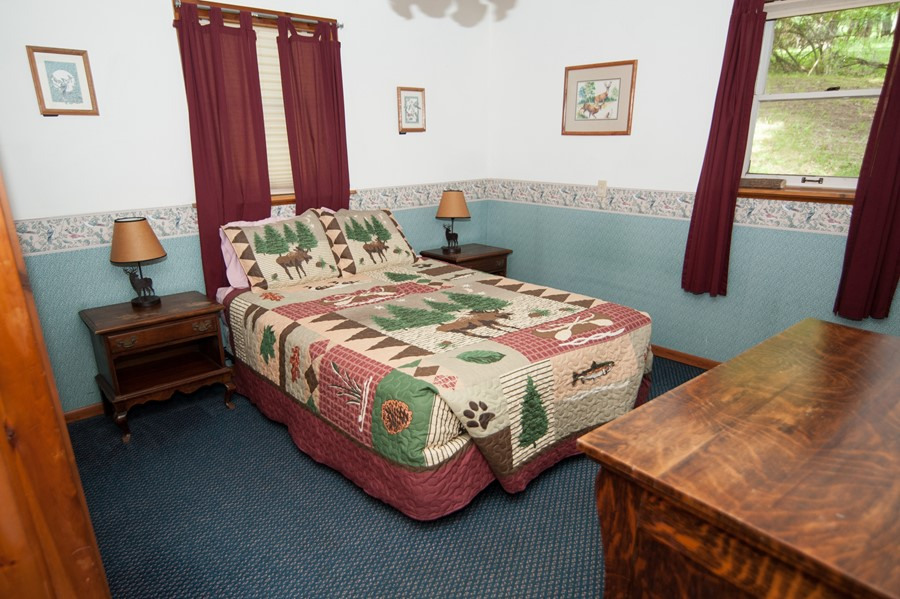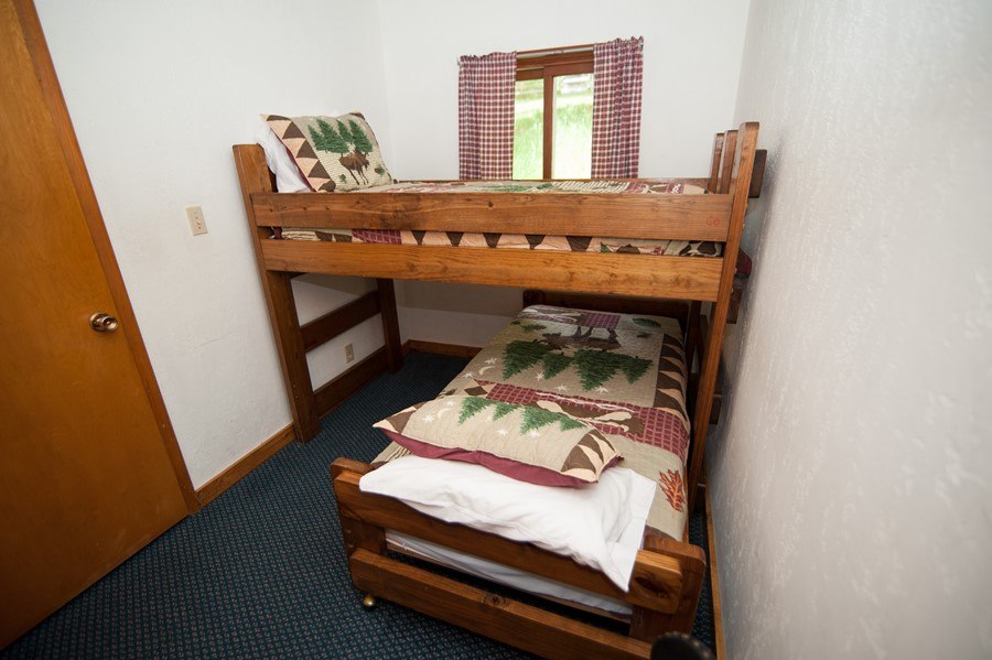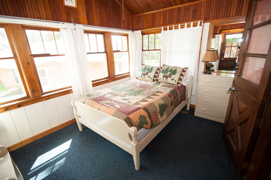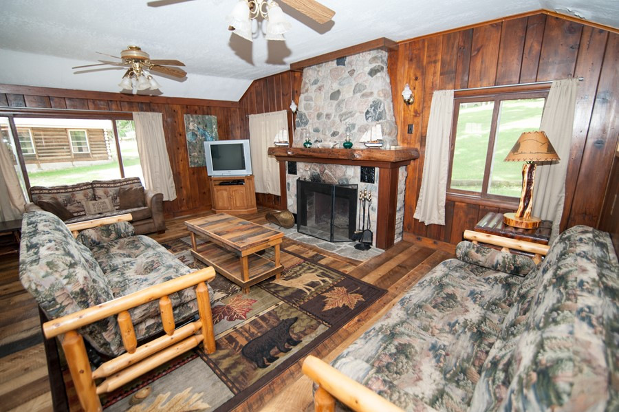 One of our most rustic, a 1400 sq.ft. 4 bedroom cabin with 2 bathrooms; 1 shower, 1 shower w/tub. One queen, 1 full, 1 twin/twin bunk, 1 full/twin bunk (not pictured), plus 2 living room pullouts. Stone fireplace in large living room space. Great large families. Dishwasher. Huge wrap-around deck with lake view. Rate based on 8, max occupancy 12.